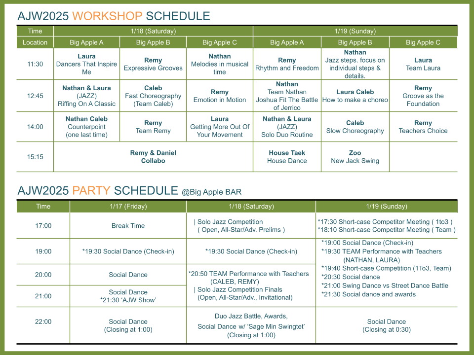 | 20:00 | π *20:50 TEAM Performance with Teachers (CALEB, REMY) Solo Jazz Competition Finals (Open, All-Star/Adv., Invitational) | ||